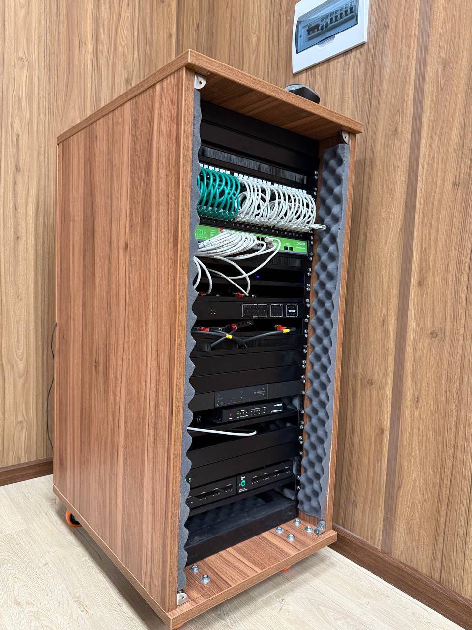 Заказчик настоял на размещении телекоммуникационного шкафа непосредственно в переговорной комнате. ООО «ВДК ПРО» спроектировало и изготовило шкаф индивидуального дизайна: